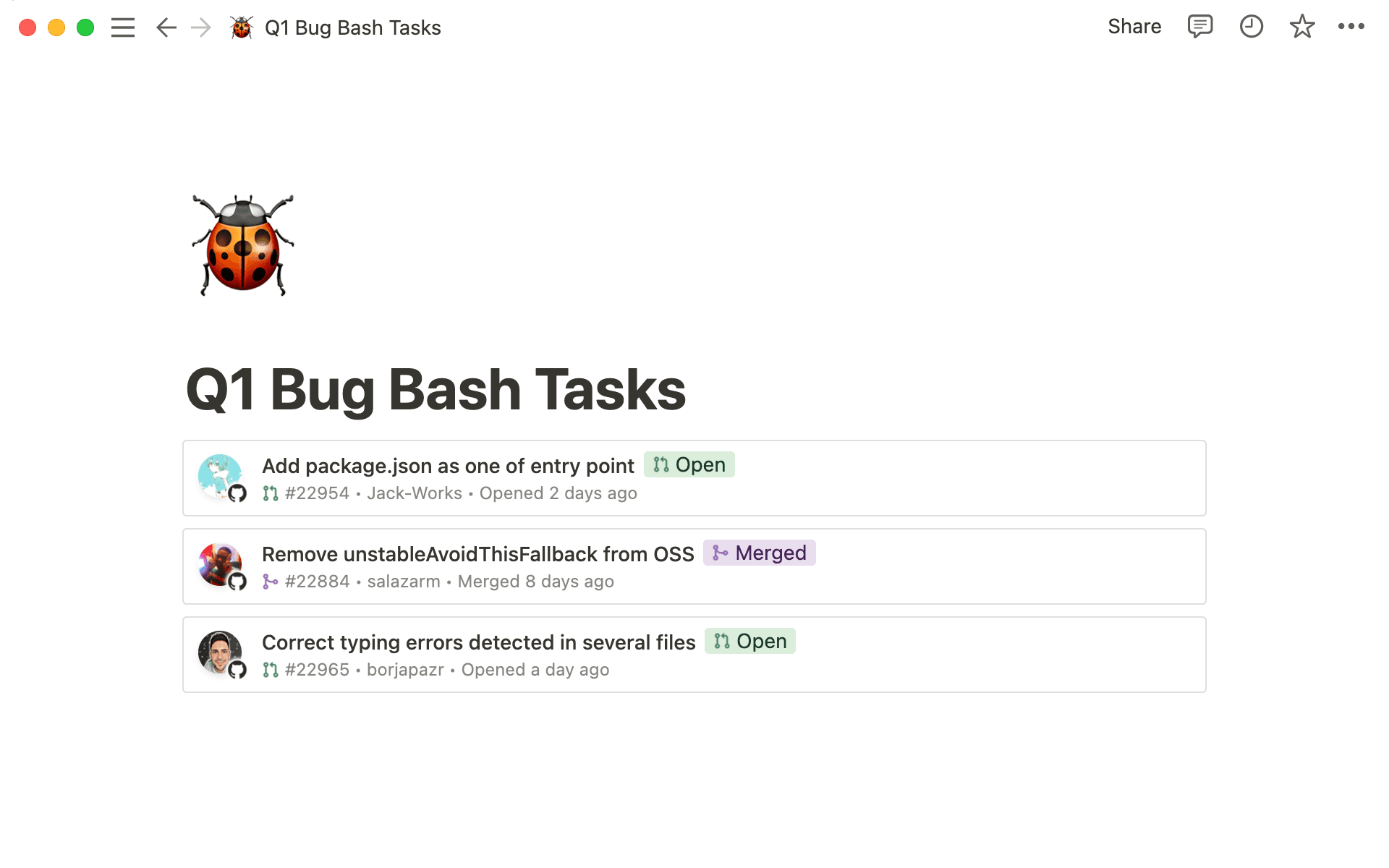 See up-to-date information from other tools, all inside your Notion workspace. Now when you paste a link from Jira, GitHub, Slack, Trello, and Asana, you can turn it into a dynamic preview โ either as an inline mention or as its own block. We'll be adding support for many more tools soon; this is just the beginning!